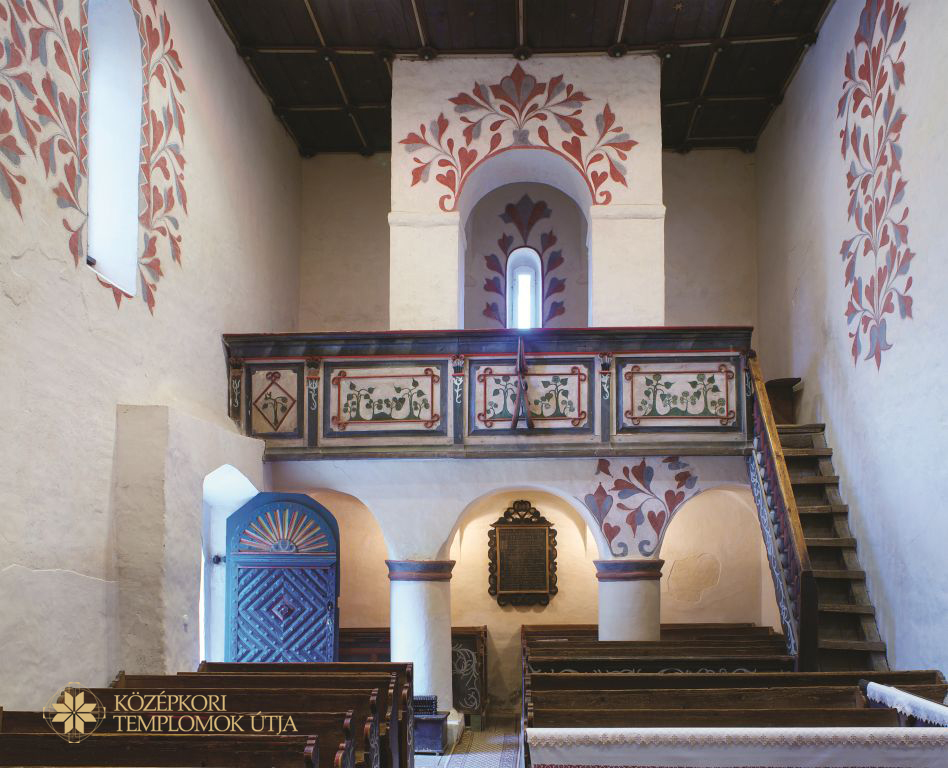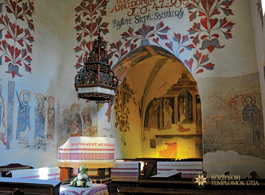A templom falát 1642-ben hímzésre emlékeztető, virágos-leveles kék–vörös mintákkal pingálták tele. Amióta föltárták és restaurálták a középkori freskókat, azóta megváltozott a templombelső hangulata. A keresztboltozatú szentélyt a hajótól enyhén csúcsosodó diadalív választja el. A templom különleges értékei közé tartoznak a helyreállítás során megtalált freskók: János evangélista, Koma és Damján, Pál és Péter apostol alakja látható a szószék mögötti falfelületen, a diadalíven és a szentélyben sorakoznak az apostolok képei.