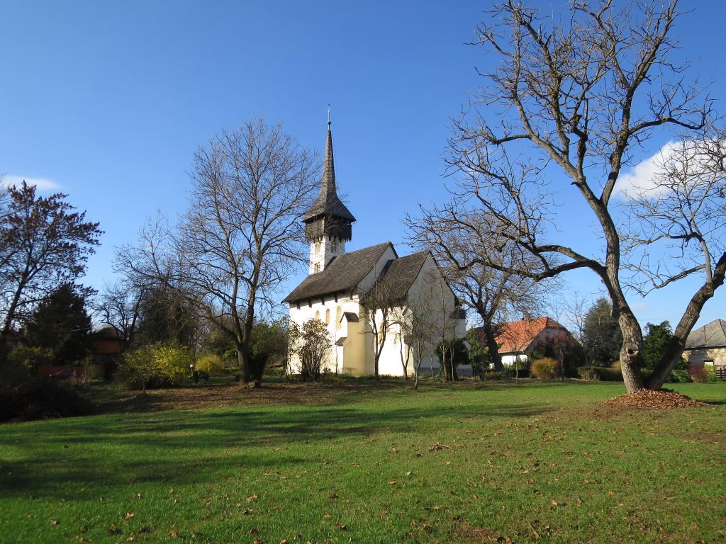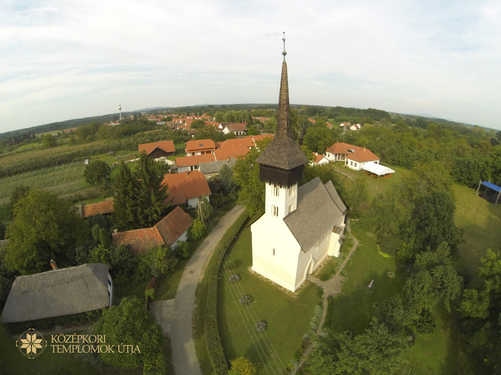 A szűk toronyban sohasem függött harang, hanem a 18. században a templomtól keletre egyszerű fából ácsolt harangtornyot építettek. A déli oldalon nyílik a templom bejárata, a félköríves, kettős lépcsőzésű kapun keresztül, melynek ajtaja 18. századi. A déli falat két nagyobb és közöttük egy kisebb, félköríves záródású ablak töri át (egykori festett díszük töredékei is előkerültek). A 17. században széles körben elterjedt magyaros motívumok (szívvirág, levélcsokor meg nefelejcs) valaha bizonyára az egész falfelületet beborították. Az északi falon nincs ablak.