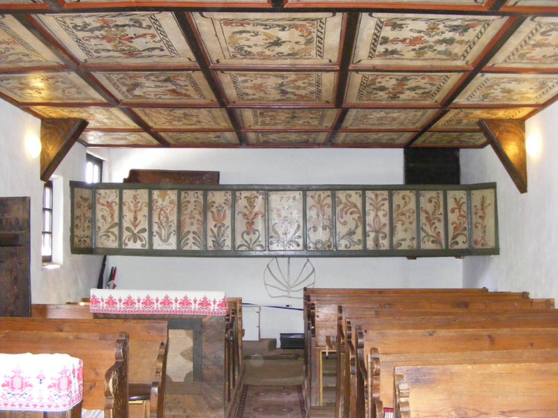 Az egész olyan, mint egy tavaszi virágos, sziporkázó rét. A színpompás mennyezet és a berendezés jól érvényesül az egyszerű, fehérre meszelt falak között. A fehér fal a népi puritánság jelképe. A templom padozata a korábban épített részen tégla, a nyugatí irányú bővítésnél döngölt agyag.